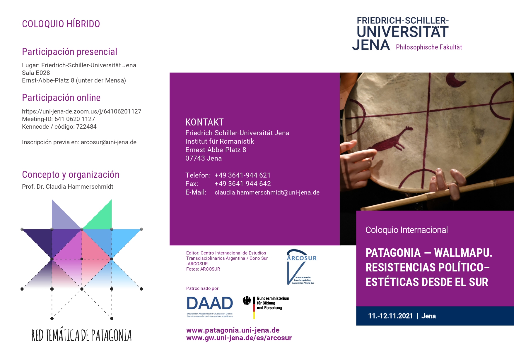 Los días jueves 11 y viernes 12 de noviembre se llevará a cabo el Coloquio Internacional “Patagonia – Wallmapu. Resistencias político-estéticas desde el Sur”, organizado por la Universidad Friedrich Schiller de Jena de Alemania, y apoyado por el Centro Internacional de Estudios Transdisciplinarios Argentina/ Cono Sur – ARCOSUR.