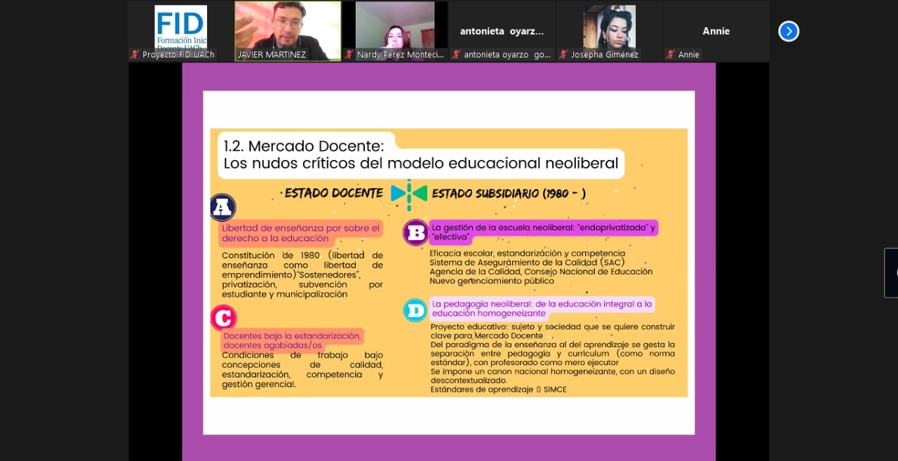 Estudiantes de pedagogías y profesoras y profesores egresados de la UACh participaron del Taller “Sistema Educacional chileno: Orientaciones para el quehacer docente” que se desarrolló en forma virtual los días 10, 17 y 24 de marzo y fue dictado por el profesor Javier Martínez, presidente del Colegio de Profesores de Valdivia. La actividad fue organizada por el Programa de Formación Inicial Docente de la UACh.