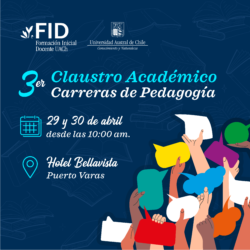 En el marco del último año de desarrollo del Programa de Formación Inicial Docente de la Universidad Austral de Chile se realizará este 3er Claustro Académico para las carreras de Pedagogías UACh de las sedes de Valdivia, Puerto Montt y Camus Coyhaique, la actividad se llevará a cabo los días 29 y 30 de abril en el Hotel Bellavista de Puerto Varas.