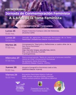 La Secretaria de Género, Sexualidades y Buen vivir en conjunto con el Comité de Género y Diversidad de la Facultad de Filosofía y Humanidades, levantaron una diversa programación de actividades presenciales en el marco de la Conmemoración Feminista “A cuatro años del movimiento estudiantil chileno feminista desde el Sur”.
