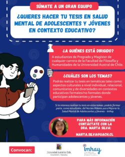 La Universidad Austral de Chile y el Núcleo Milenio para mejorar la Salud Mental de Adolescentes y Jóvenes, convocan a estudiantes de pregrado y magíster de la Facultad de Filosofía y Humanidades a participar como tesistas en el área de salud mental en contextos educativos durante el 2022.