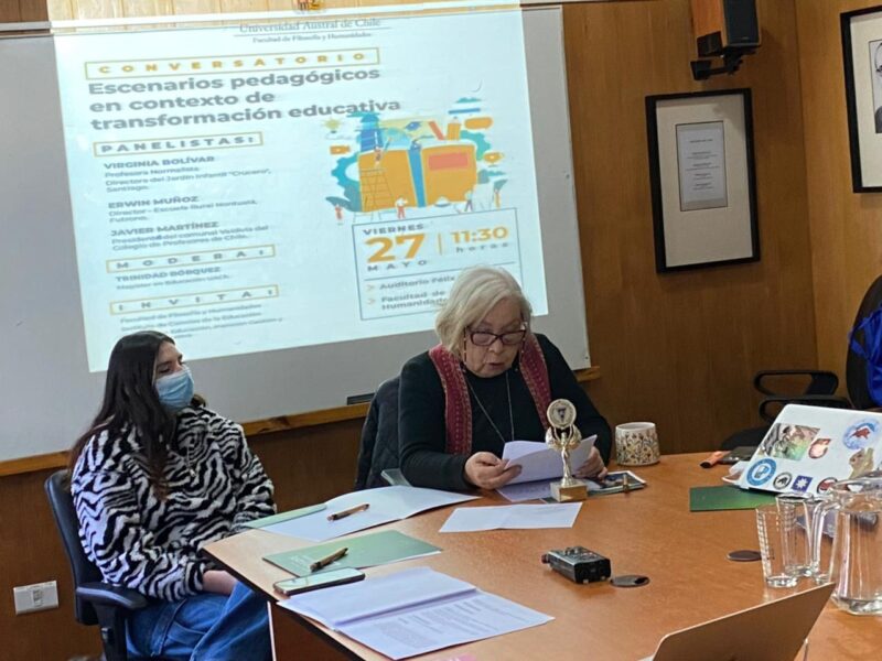 En dependencias de la Escuela de Graduados de la Facultad de Filosofía y Humanidades se desarrolló el Conversatorio “Escenarios pedagógicos en contexto de transformación educativa”, en el cual participaron como panelistas Virginia Bolívar, profesora normalista y directora del Jardín Infantil “Crucero” (Santiago); Erwin Muñoz, director de la Escuela Rural Nontuelá (Futrono) y Javier Martínez, presidente del comunal Valdivia del Colegio Profesores.
