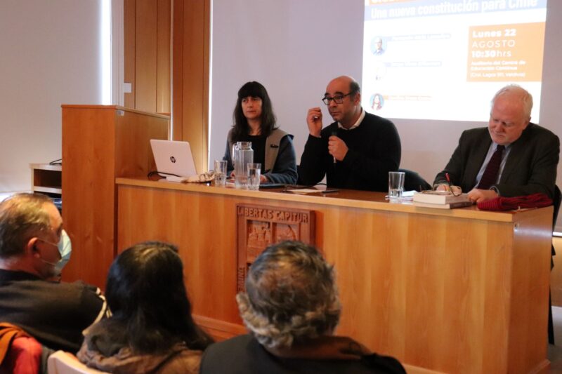 Como una instancia para compartir visiones e informar a la comunidad se realizó el Diálogo Ciudadano: una nueva constitución para Chile. El evento tuvo lugar el día lunes 22 de agosto en las dependencias del Centro de Formación Continua de la Universidad Austral de Chile y contó con la participación de Dr. Fernando Atria, académico de la Facultad de Derecho de la Universidad de Chile y presidente del Partido Fuerza Común; Jorge Vives Dibarrat, abogado Constitucionalista y ex gobernador por Valdivia; y Carolina Bruna, académica del Instituto de Filosofía y moderadora del encuentro.
