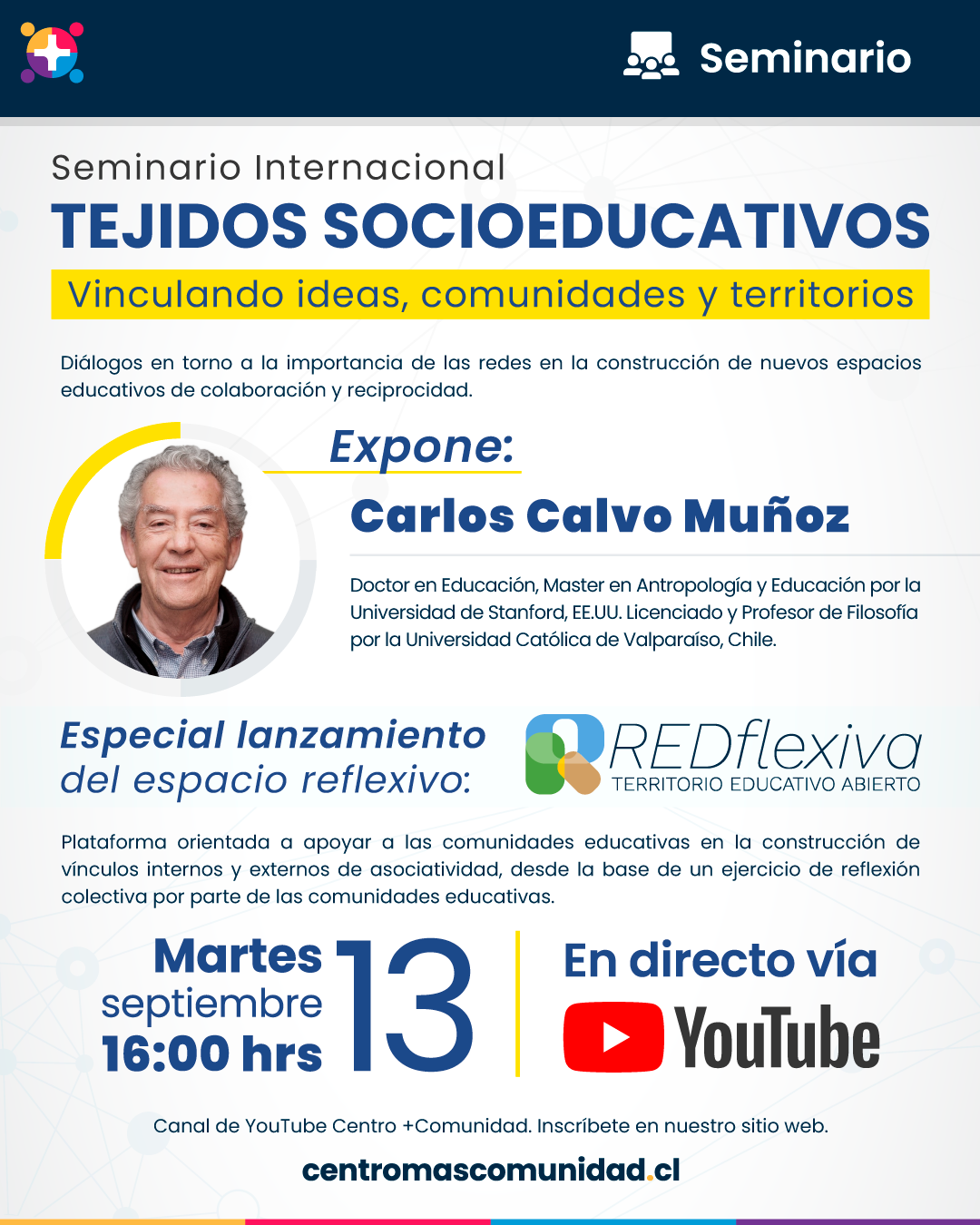 “Tejidos socioeducativos: Vinculando ideas, comunidades y territorios” es el nombre del seminario internacional organizado por el Centro de Liderazgo Educativo +Comunidad y que se realizará online a través de su canal de YouTube, el próximo martes 13 de septiembre a las 16:00. En el evento, se desarrollará un interesante diálogo en torno a la importancia de las redes en la construcción de nuevos espacios educativos de colaboración y reciprocidad.