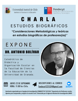 La charla será dictada por el Dr. Antonio Bolivar Catedrático de Didáctica y Organización Escolar en la Facultad de Ciencias de la Educación de la Universidad de Granada.