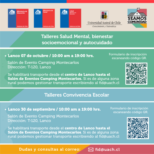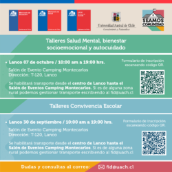 Los Próximos talleres se realizarán en la comuna de Lanco los días 30 de septiembre Taller de Convivencia Escolar y 07 de octubre Taller de Salud Mental y también en Panguipulli en las mismas fechas. Interesados e interesadas en participar pueden inscribirse en los siguientes formularios: